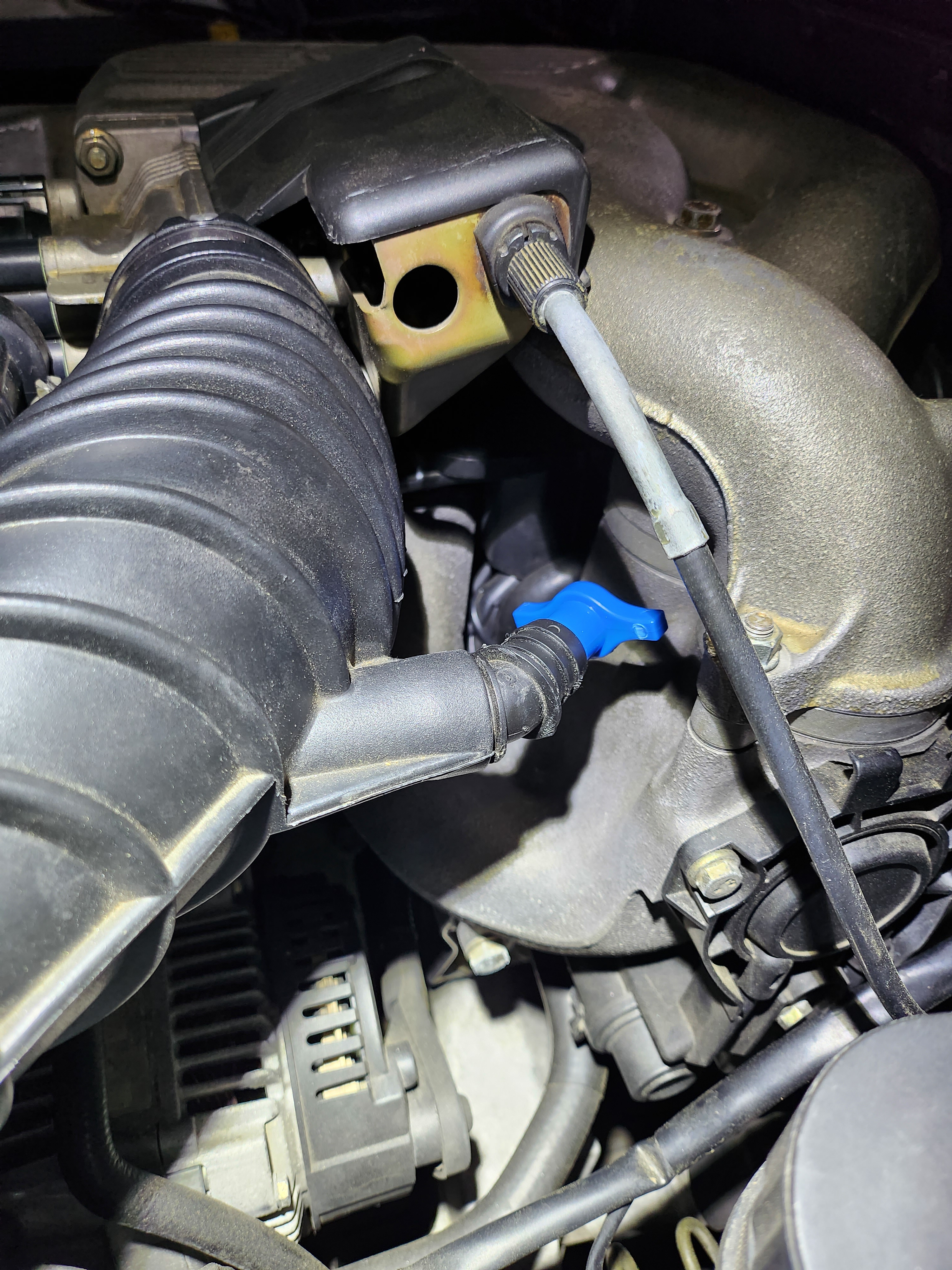 With the injectors replaced, I had a spare vacuum tree coming off the intake boot that needed to be handled. As this tree had no use I simply tossed it out and plugged the intake boot hole with a plastic PEX pipe cap I found at Lowes.