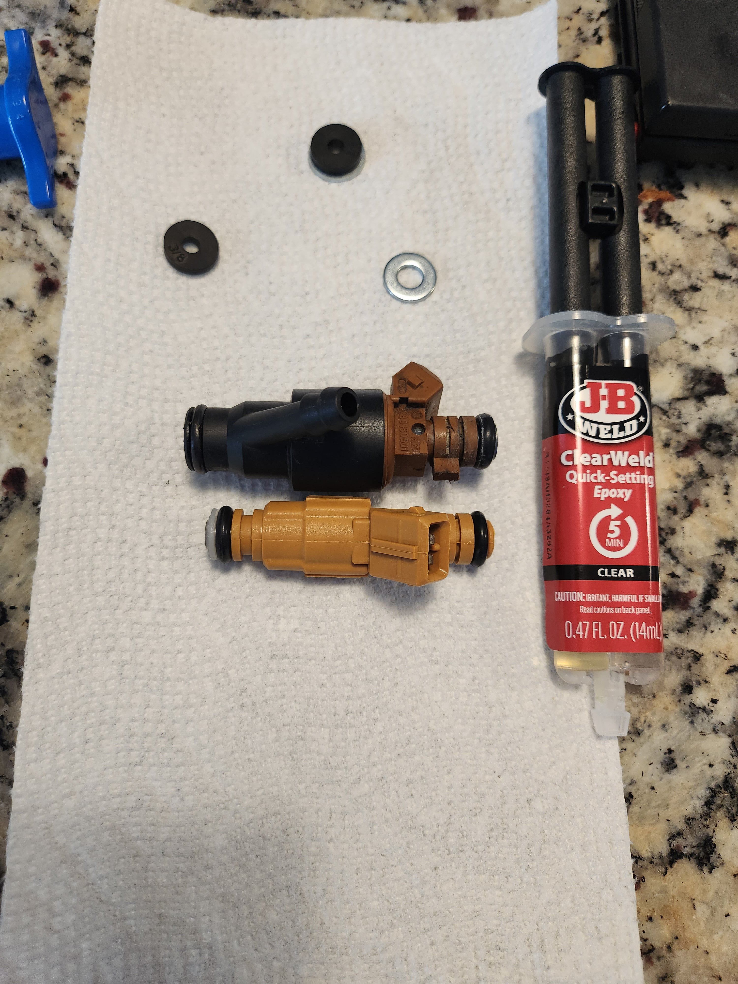 Lacking access to any equipment to manufacture a serious adapter, I made 4 bootleg adapters that raised the manifold ports by 6mm and reduced the diameter of the injection ports from 17mm to 14mm out of a washer and a rubber grommet I trimmed with a dremel and sealed the thing with RTV. It fit well on the manifold and the pressure from the tightened-down fuel rail ought to keep it in place but to make sure I secured the adapter to the manifold ports with JB Weld #justmechanicstuff. Soon I will design a part in a CAD that can be machined, but lacking both relevant CAD experience and access to a lathe I could not machine these out of a metal as I'd prefer.