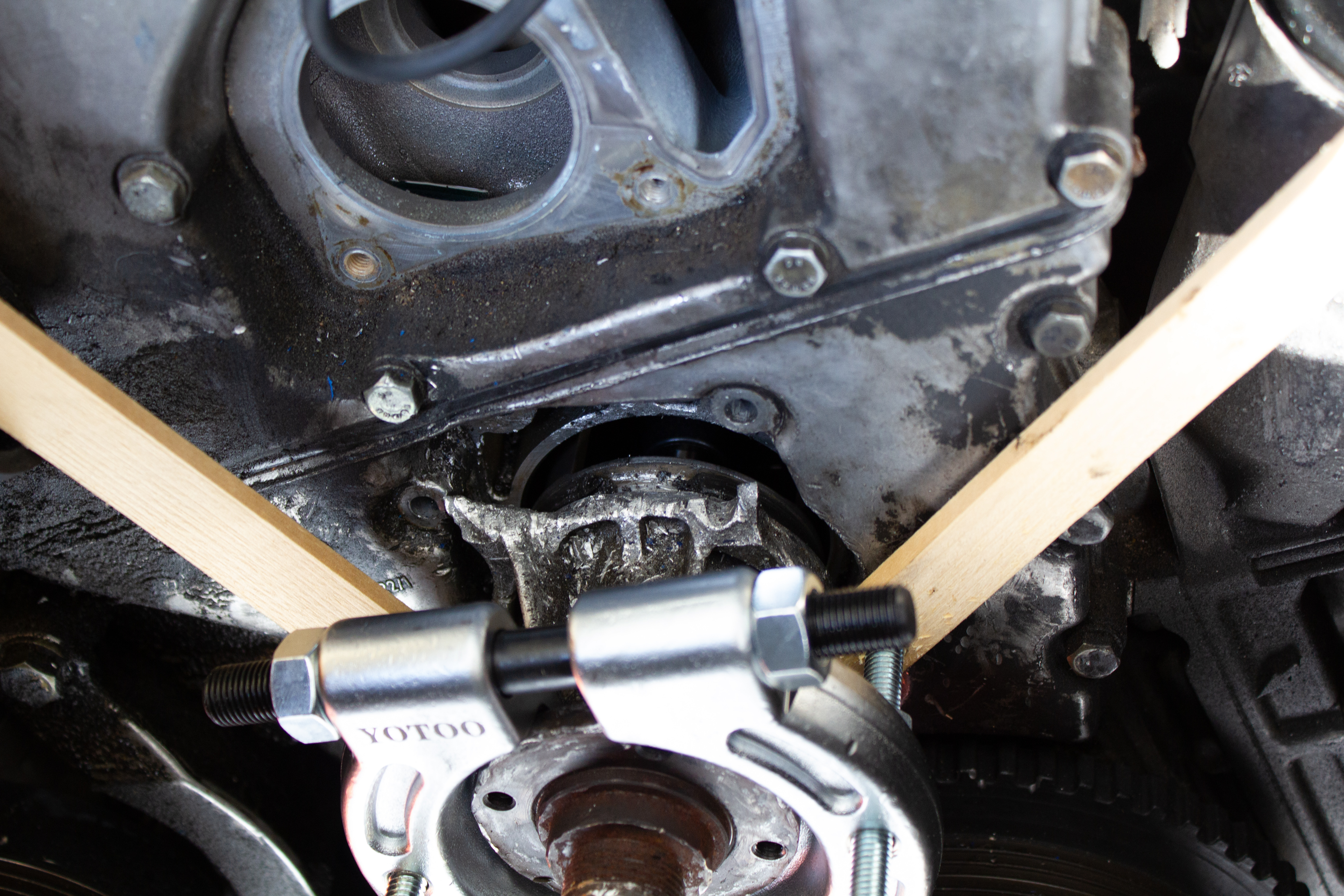 The particular puller I ordered had holes tapped for an M9 bolt which is extremely rare and weird that they did this. The extensions they provided of course fit in these holes, but I needed bolts to go through these holes, not extensions to thread halfway into them. Because of their rarity M9 bolts are also quite expensive; I decided against ordering 2 bolts for $40 and looked for another solution to the bolt thing. The hardware store near me sells only the even-numbered metric bolts, unsurprisingly; I settled on using a 5/16" bolt which will fit in a 9mm sized hole and, because this would not thread in that hole on the puller, a corresponding nut on the other side of the puller to thread the bolt through. I placed two shims of wood against the block to prevent further cosmetic damage to the timing case.