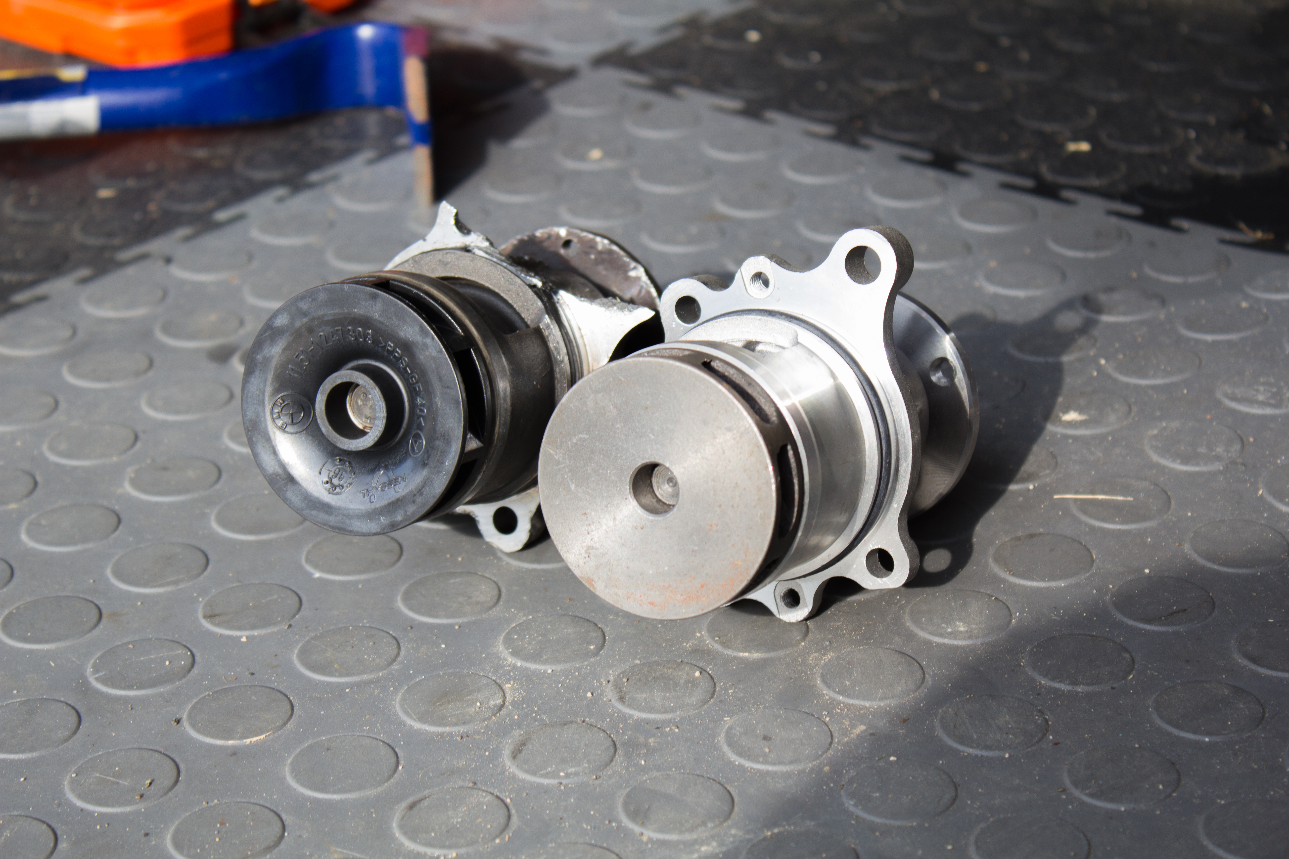 It's worth noting that a hot engine is not always a result of a water pump failure but a water pump failure will eventually result in engine overheating. For this reason, replacing the factory-installed water pump in the E36 with a pump using a metal impeller is a common maintainance item that supports the longevity of the engine and will protect against being stranded by an overheated engine. If the engine is allowed to overheat significantly it is very likely to sustain fatal damage requiring a full teardown. Even worse, the ECU buffers the temperature reading from the engine so the temperature displayed in the cabin thermometer lags what the engine is actually experiencing. By the time the engine overheat light comes on the engine may already be in dangerous territory.
