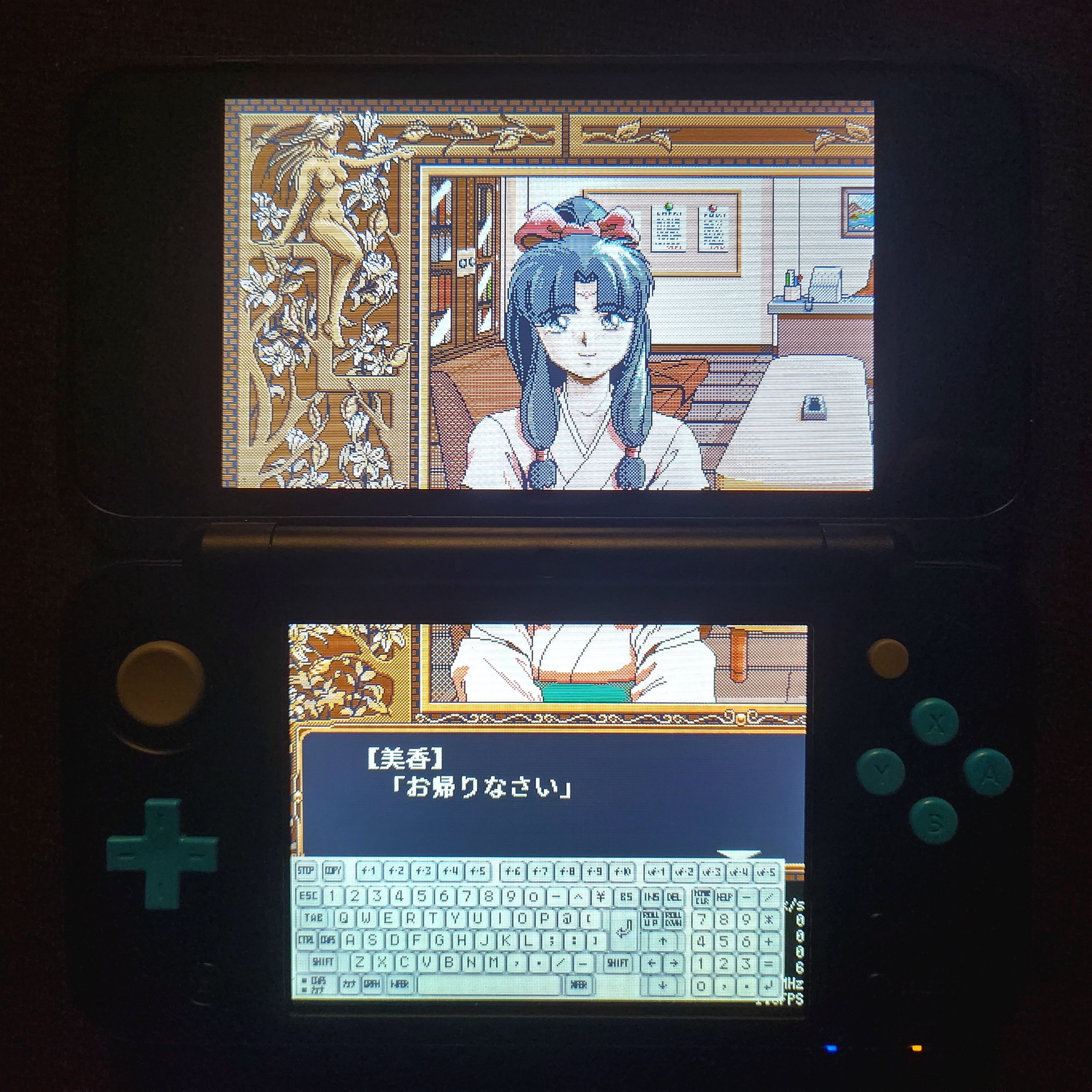 Because the DS is a fun little portable console I decided to use it as the main vehicle for learning new Japanese words. Recently I remembered how much I've forgotten how to write in Japanese, and a portable console with a stylus is a nice way to practice. Plus there are lots of games on the DS I can learn from while I practice writing. While I researched what games are heavy on dialogue on the DS I remembered that the PC98 was a thing and had so, so many adventure games that were heavy on text. And I love its color palette. As it happens there is a port of Neko Project 2 for the DS, a PC98 emulator.