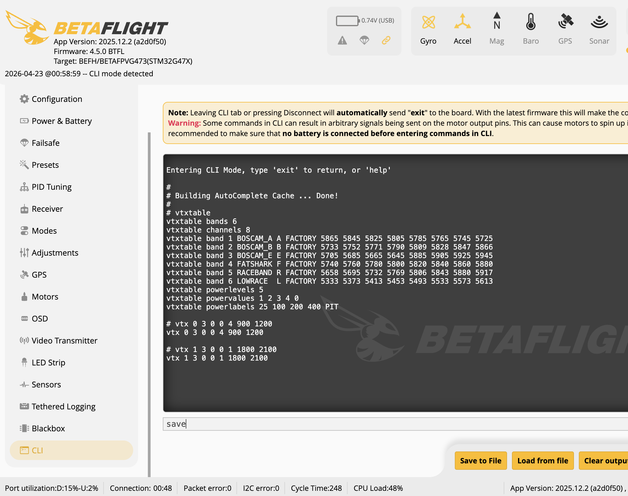 and the VTX table will be saved to the flight controller.