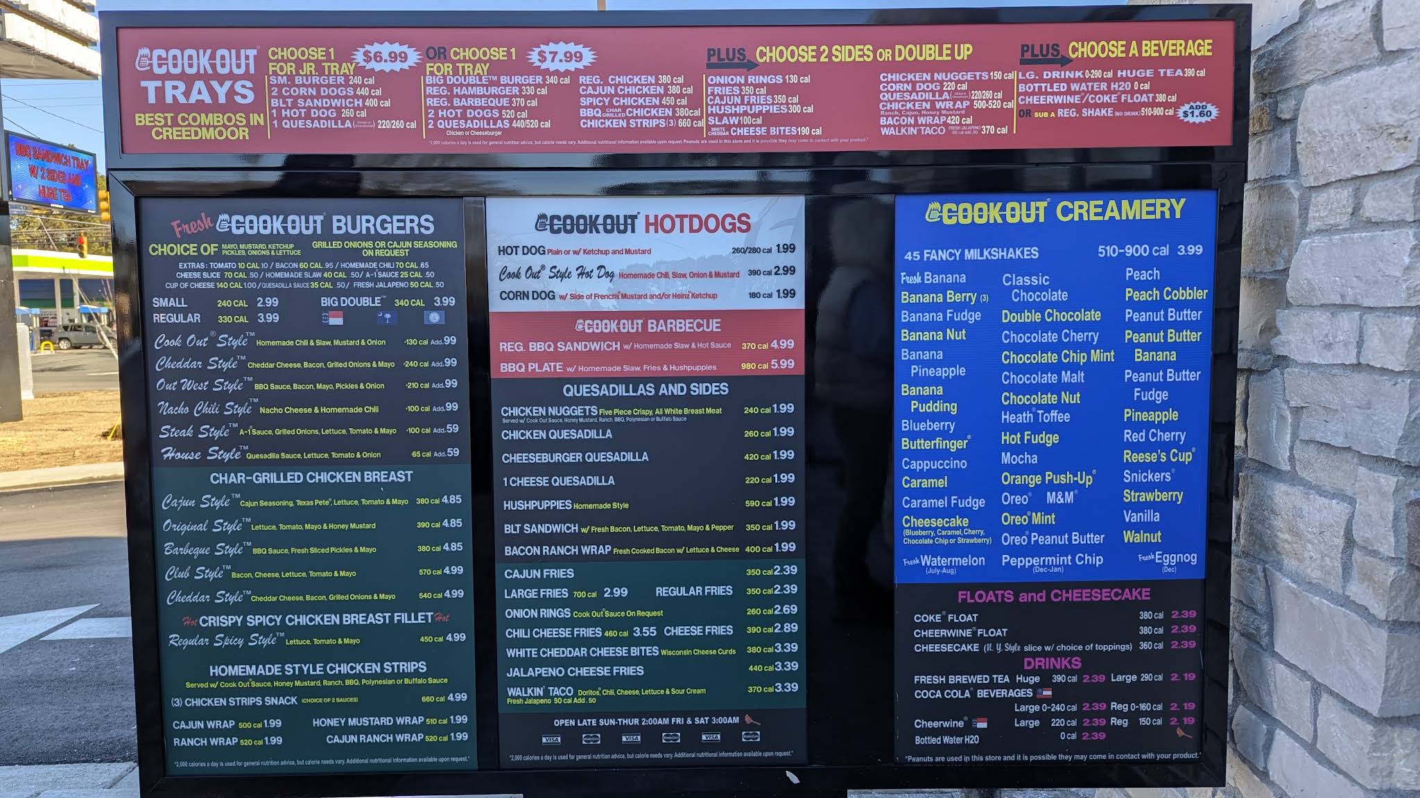 The menu triptych is daunting. The bravest people I know freeze up like Microsoft Windows ME under memory pressure when they see it. Don't worry, it's actually easy to order at a Cookout.