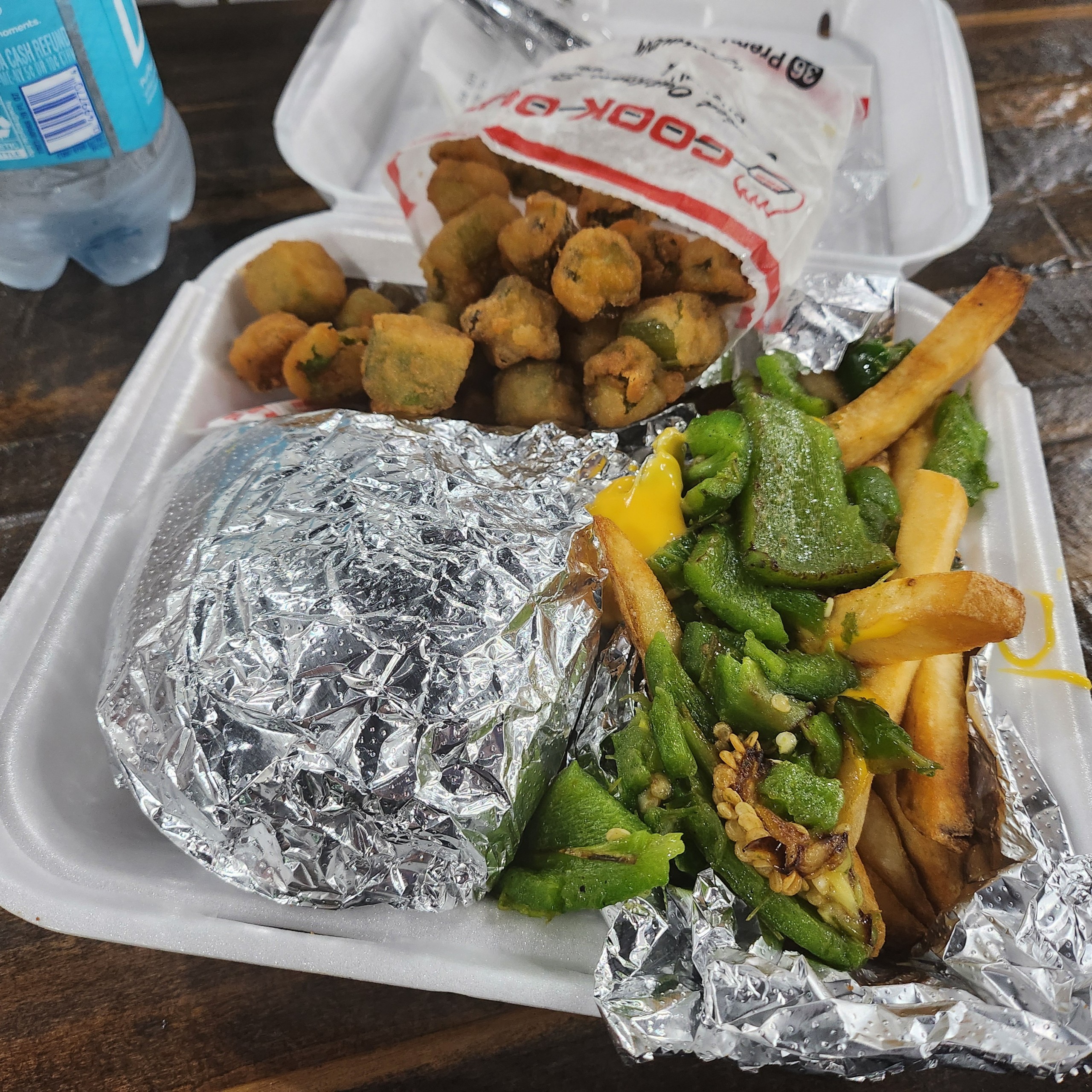 Big double tray with grilled onions and jalapenos; okra and jalapeno cheese fries; bottled water