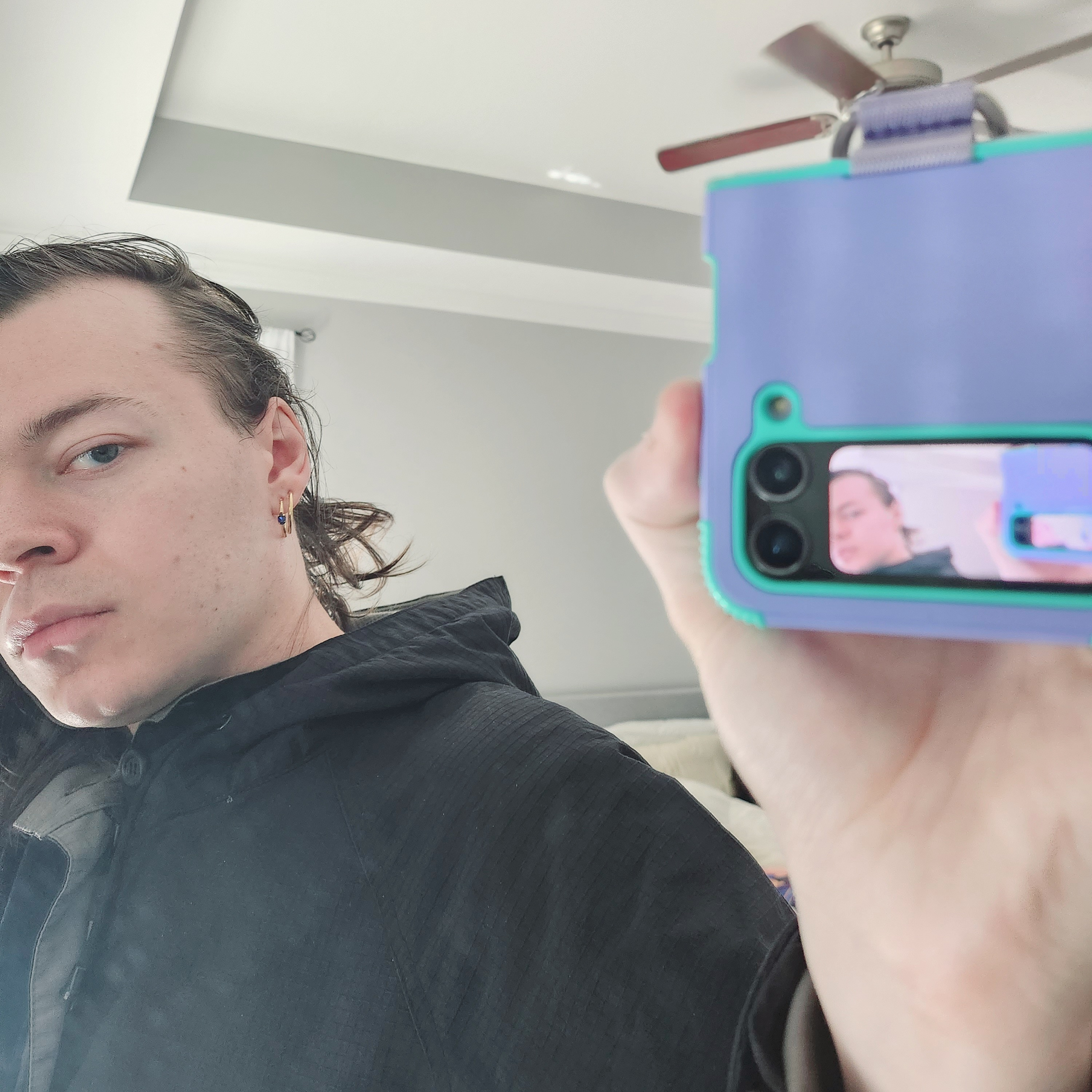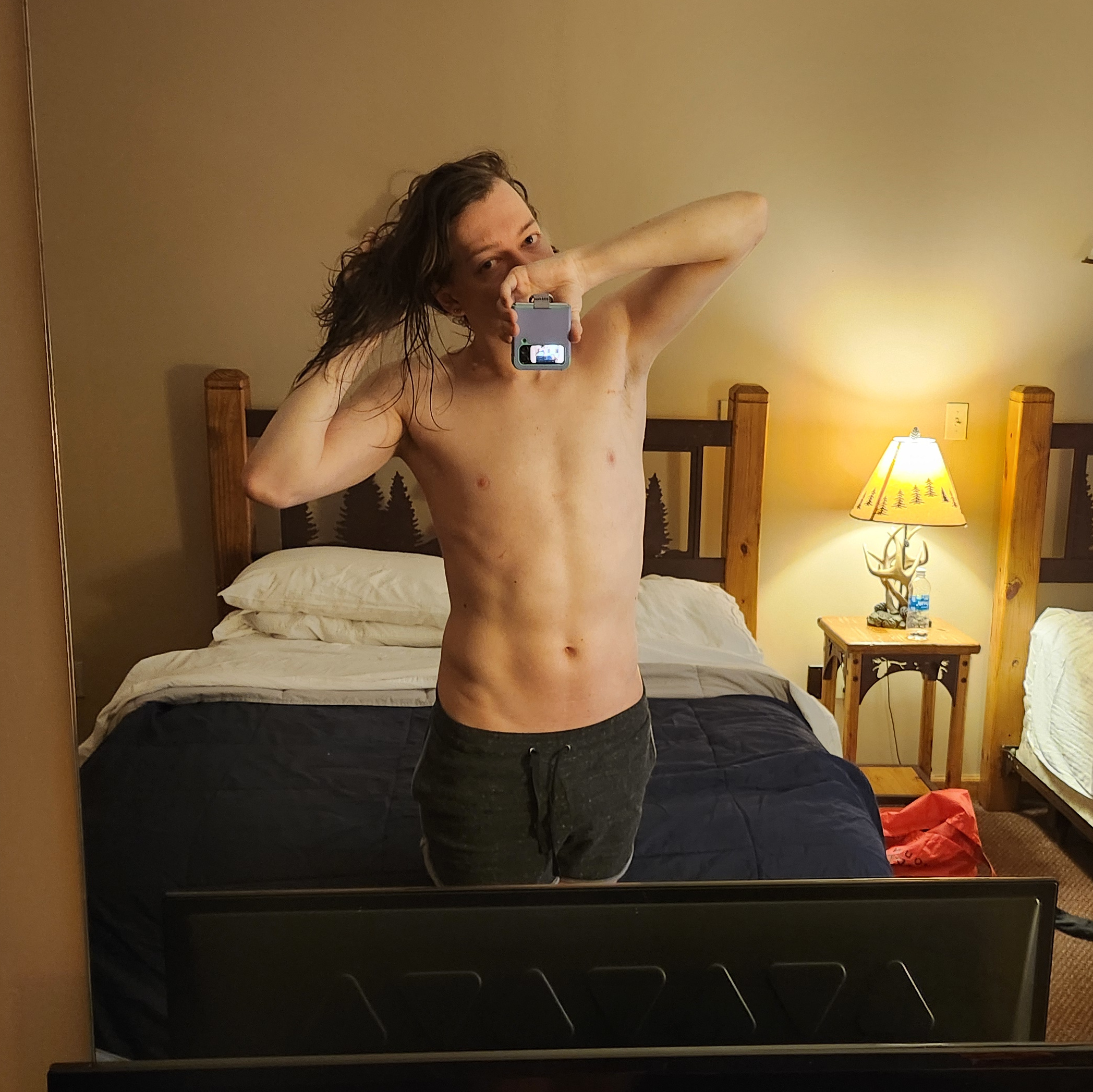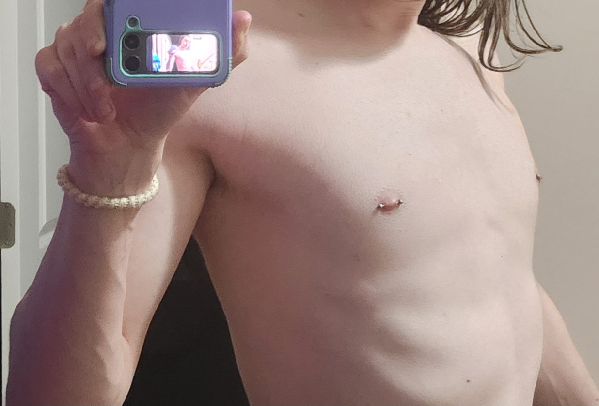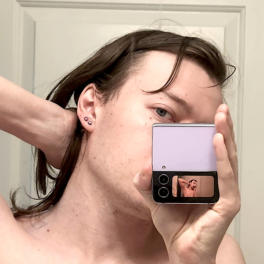 It's unfortunate that I have to play within the bounds of the rules of the game, marked by my anatomy, but I did find very recently that a piercing through the flat cartilage near the top and edge of my ear, called a "flat" piercing, was do-able and would look similar; I did it while vising NYC for work reasons. Also while on this 2-week trip I expanded my lobe piercings from 2 to 3. These 4 were my first lobe piercings since my original 4 in late 2023. Being pierced through cartilage certainly hurt more but not a significant amount. Maybe having my nipples pierced (below) readied me for anything.