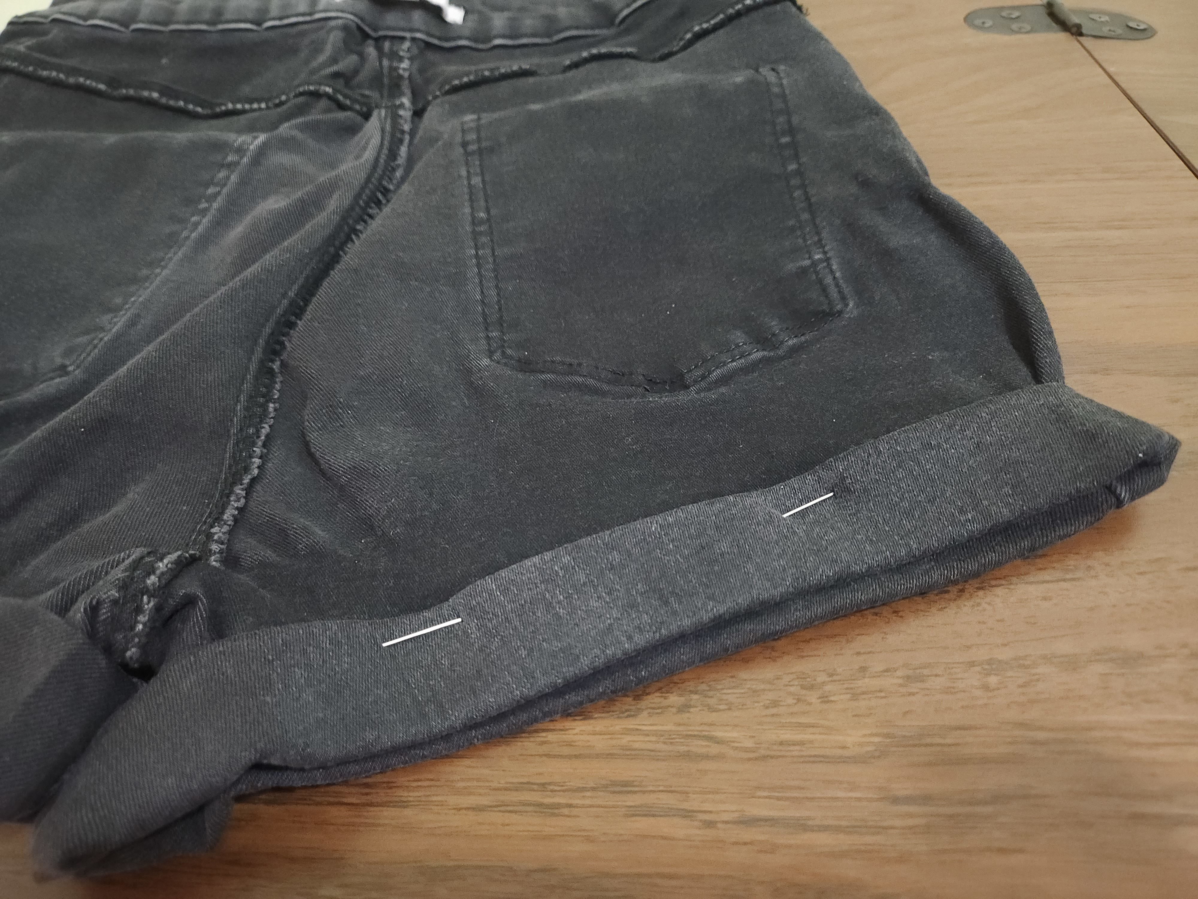 To create the hem I turned the new cutoffs inside out then folded the legs up a half-inch, then folded them over again another half-inch to the first line I marked at 2.5-inch inseam. The reason for folding twice is so that the raw edge does not fray and is safely tucked under a layer of fabric. I plugged in my iron and pressed the folds flat, then pinned them to make sure they would not move while stitching the hem.