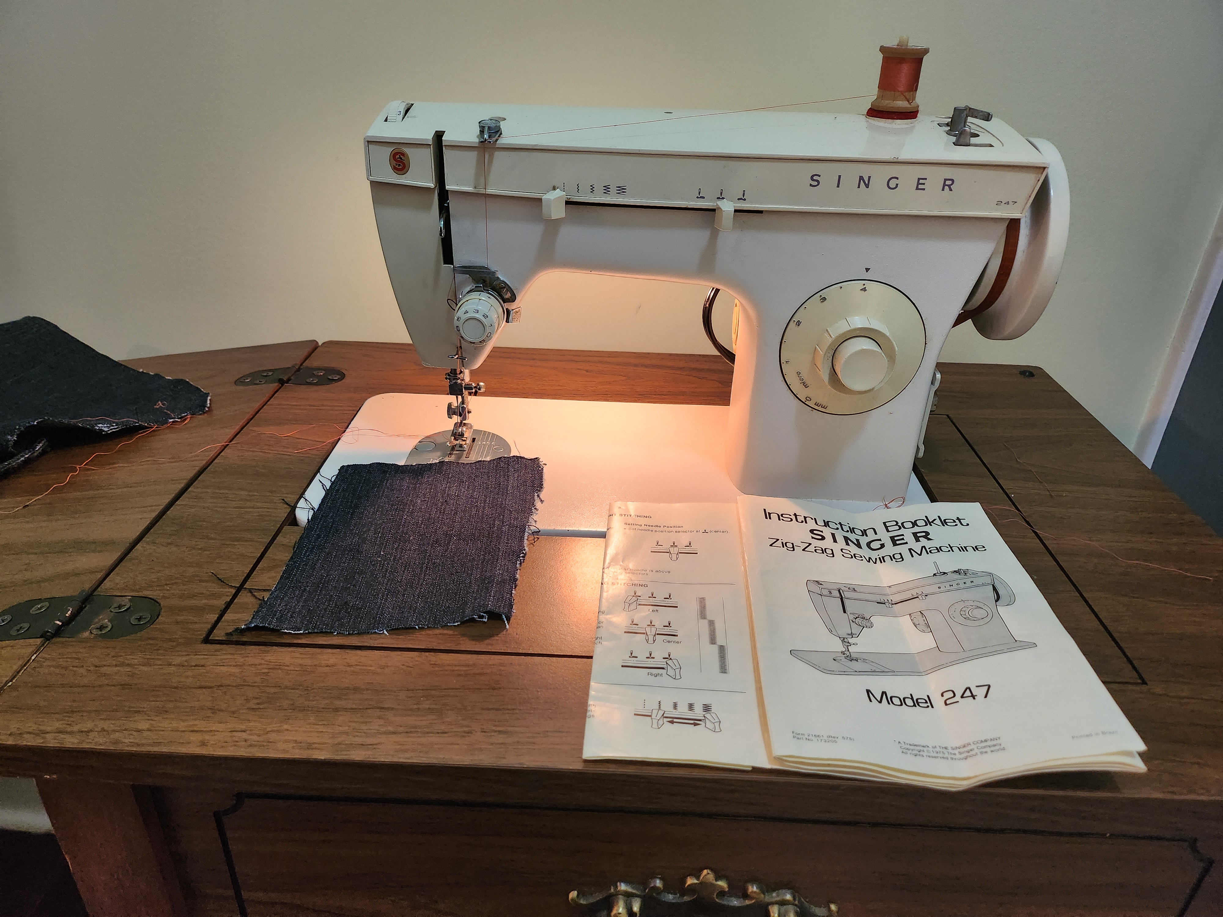 Recently I've found myself in the care of a Singer “Zig-zag” Sewing Machine Model 247 from the mid-70s built into a table. I'm not a fan of the aesthetics of the enclosure as it has all the appearances of a cabinet without the drawers part. If I was designing this I'd rather just not have an ornate handle on the front at all (because it's not a drawer) but I'm not one to turn down a free sewing machine. The copyright date on the manual is 1975.