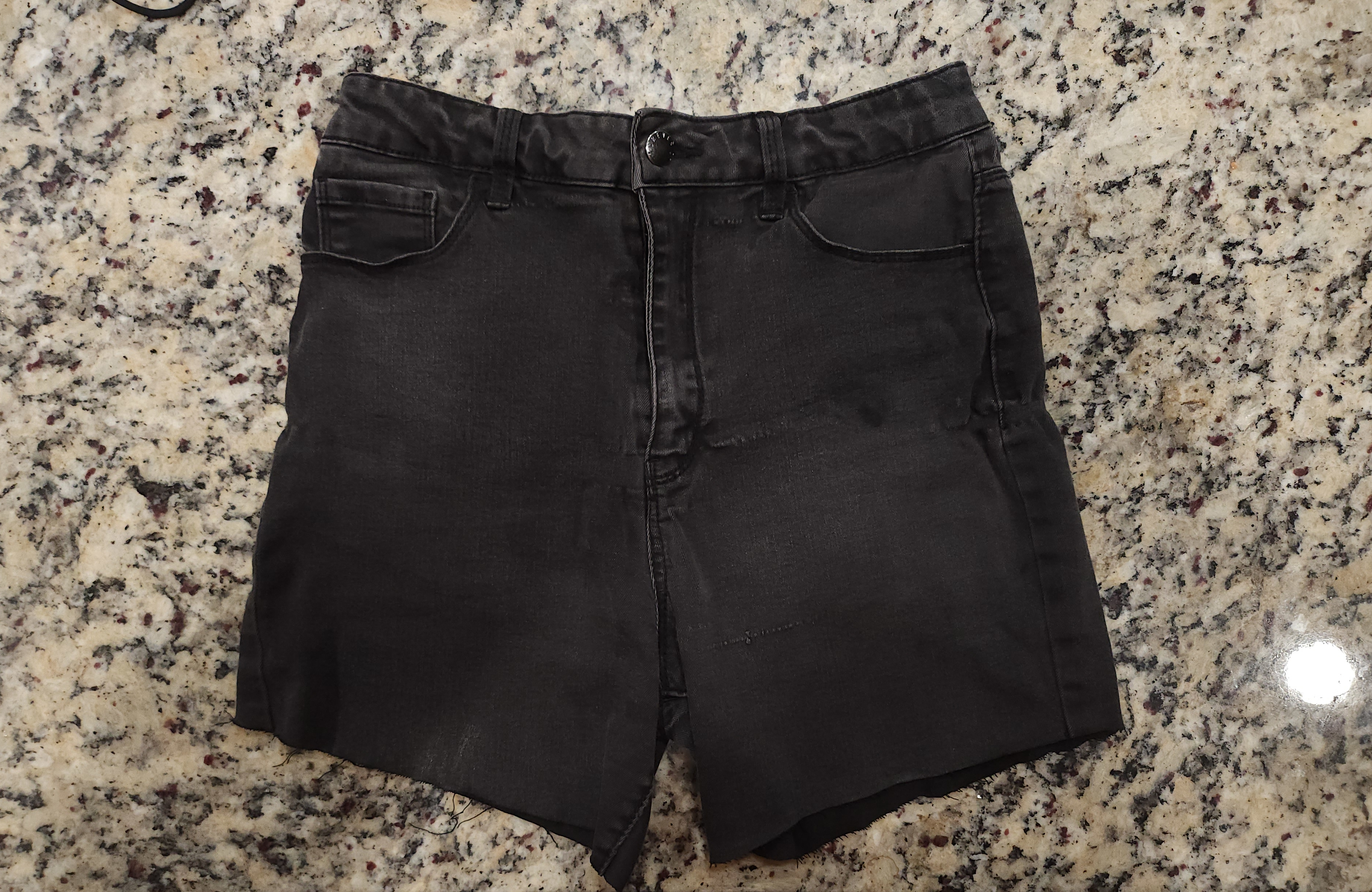 Black denim jeans at a 3.5-inch inseam after being cut but before being hemmed, note the frays already showing at the edge