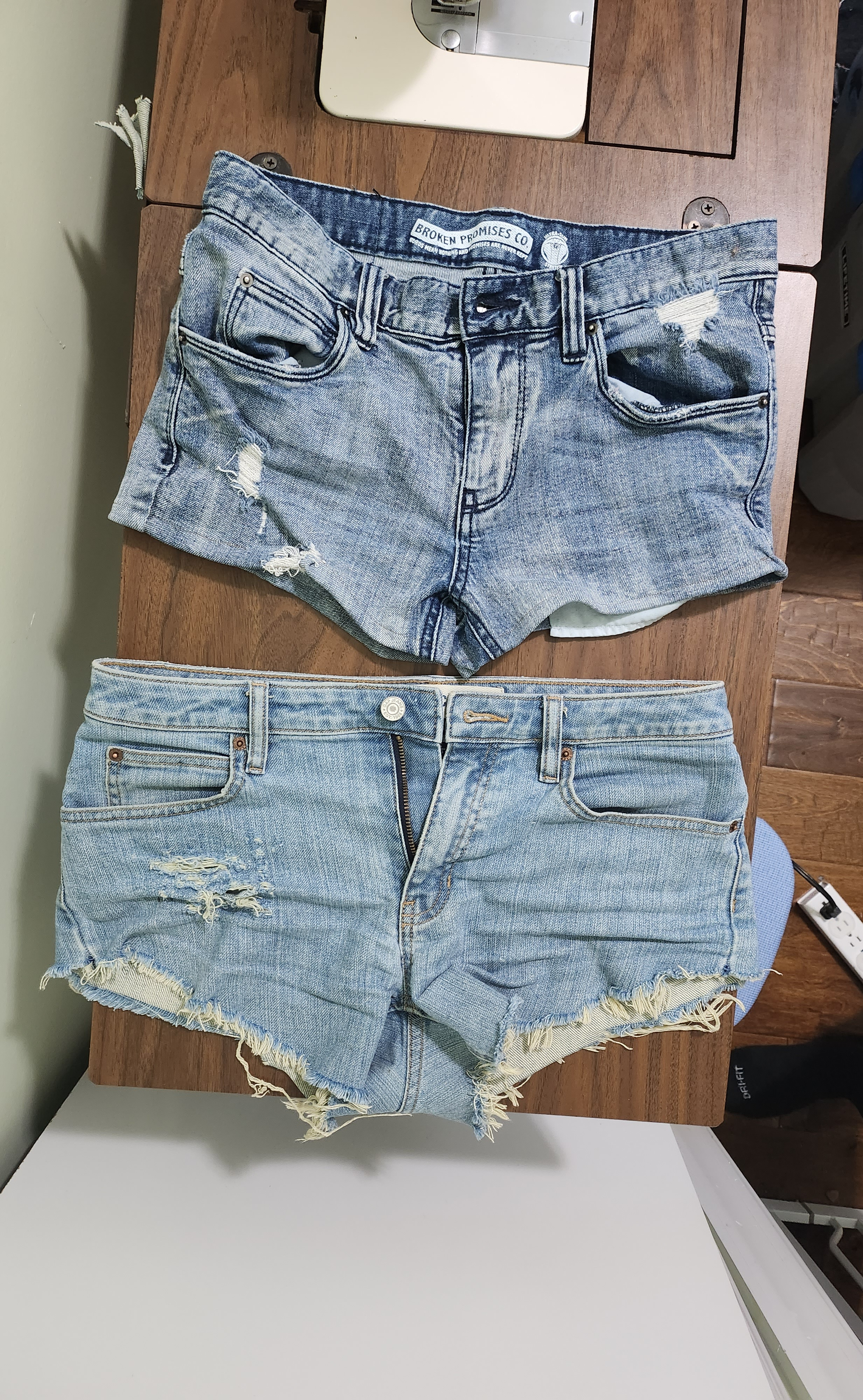 With my new pairs of jeans I measured down to the length I wanted. Using fabric chalk I marked down to about where my knuckles rest against my leg when standing straight up meaning these shorts would have about a 2.5-inch inseam. I then marked 1 inch below that, folded the jeans over and cut the legs off at that spot, making an initial 3.5-inch inseam.