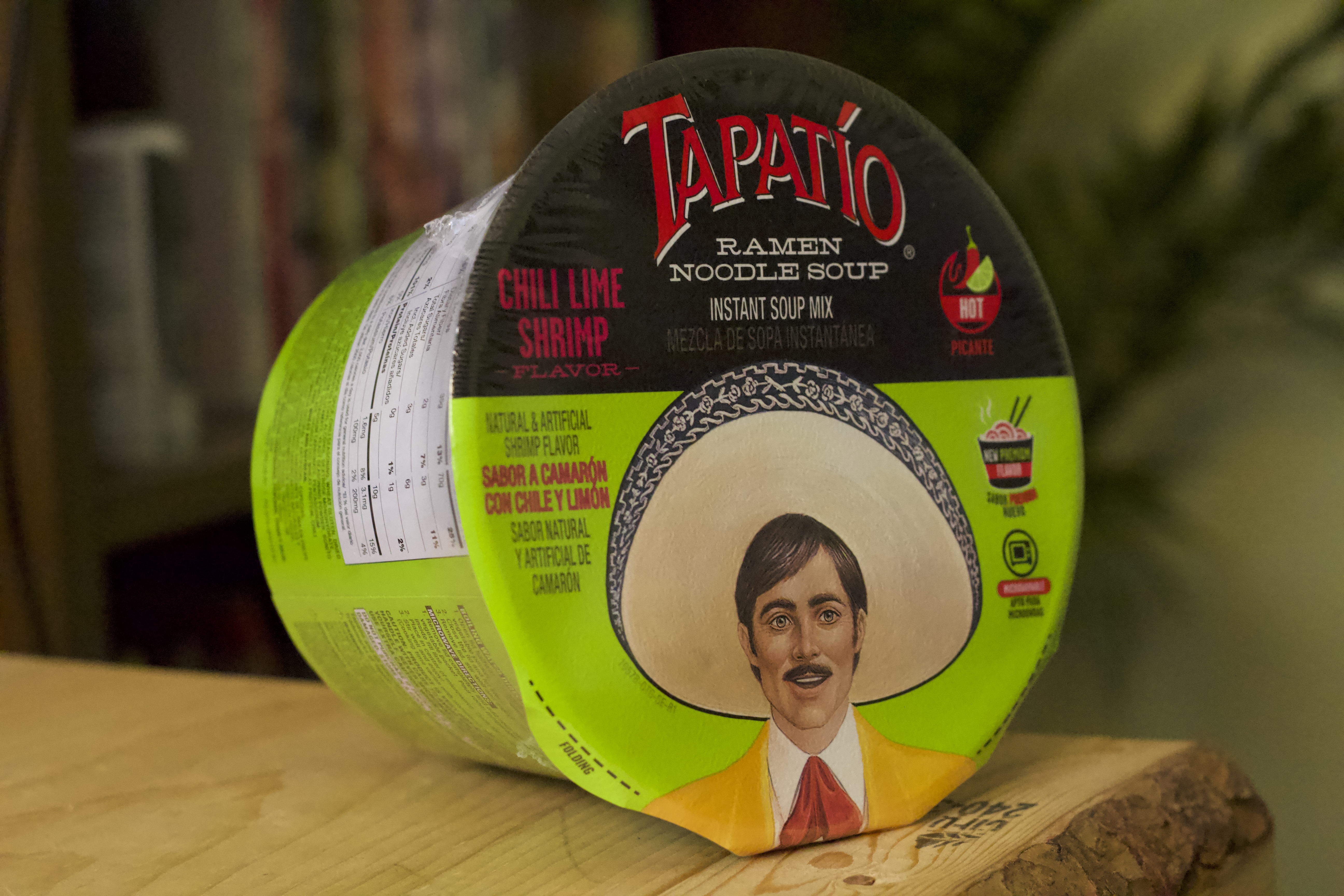 Tapatío is a hot sauce. Evidently they also make cup noodles? Since 2018 it seems. It's easy to spot Tapatío on the shelf from a long way away because of the smiling man in the sombrero on the front of the cup or bowl.